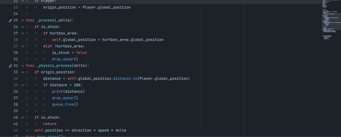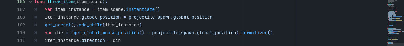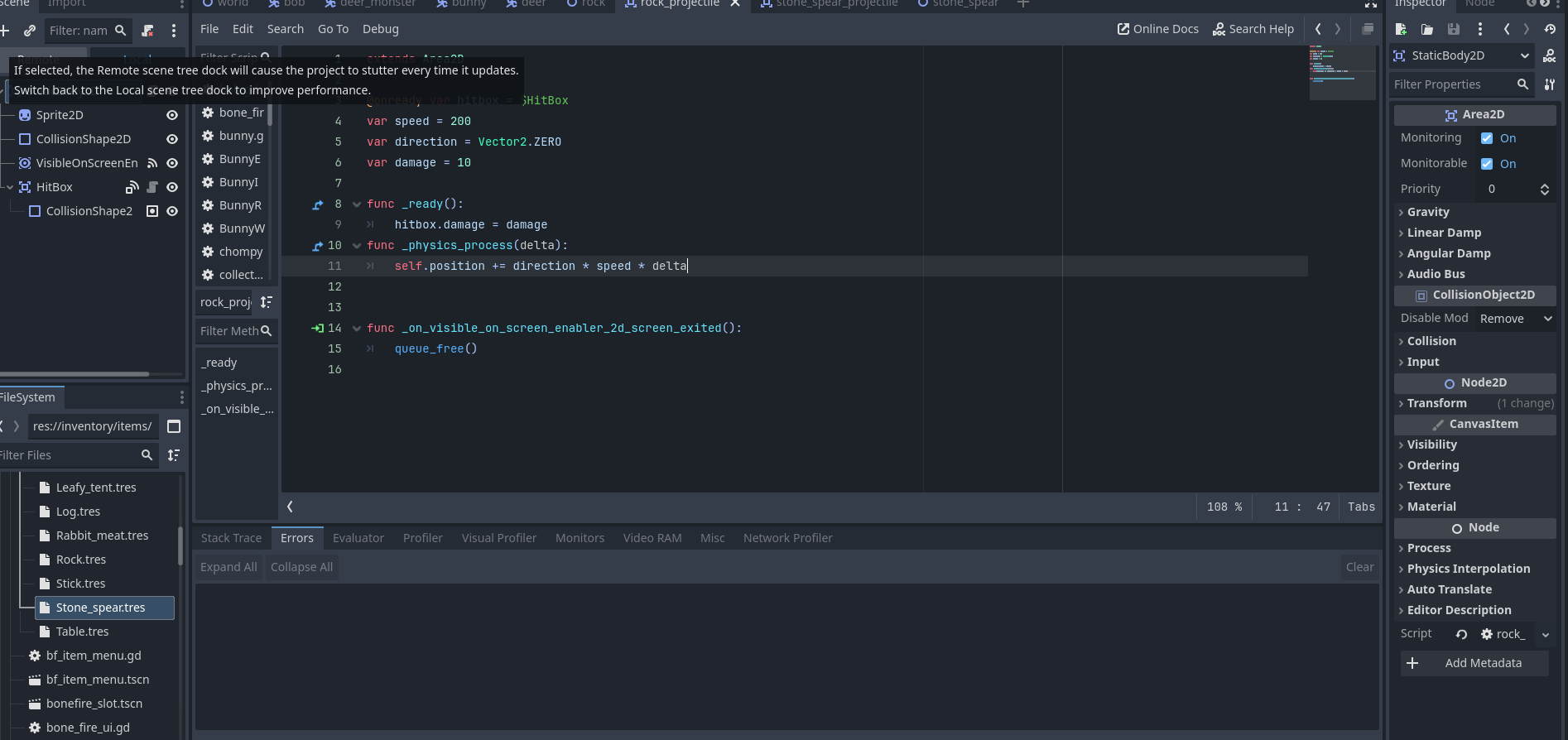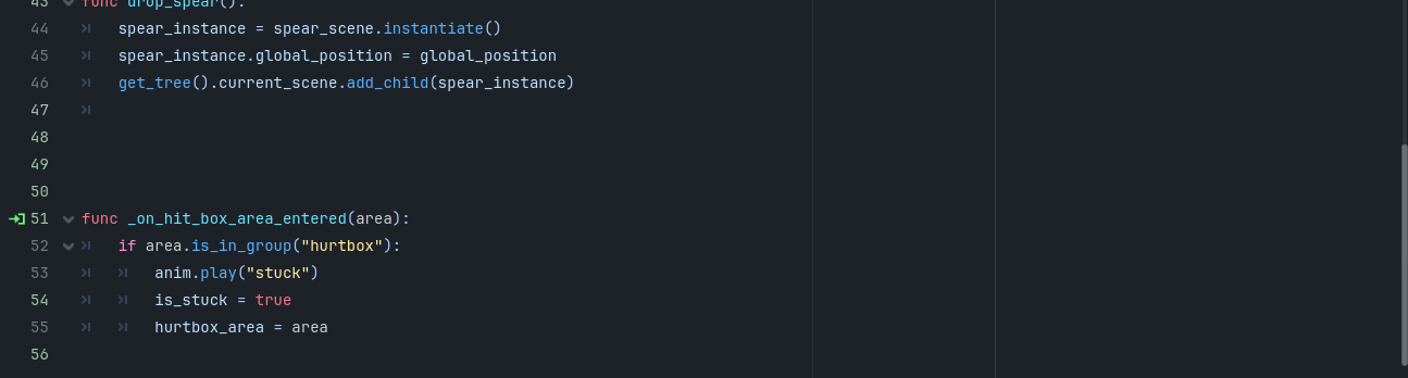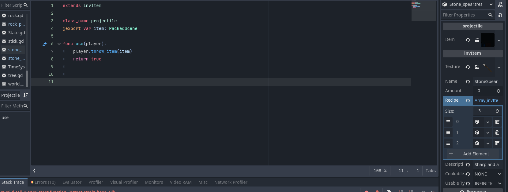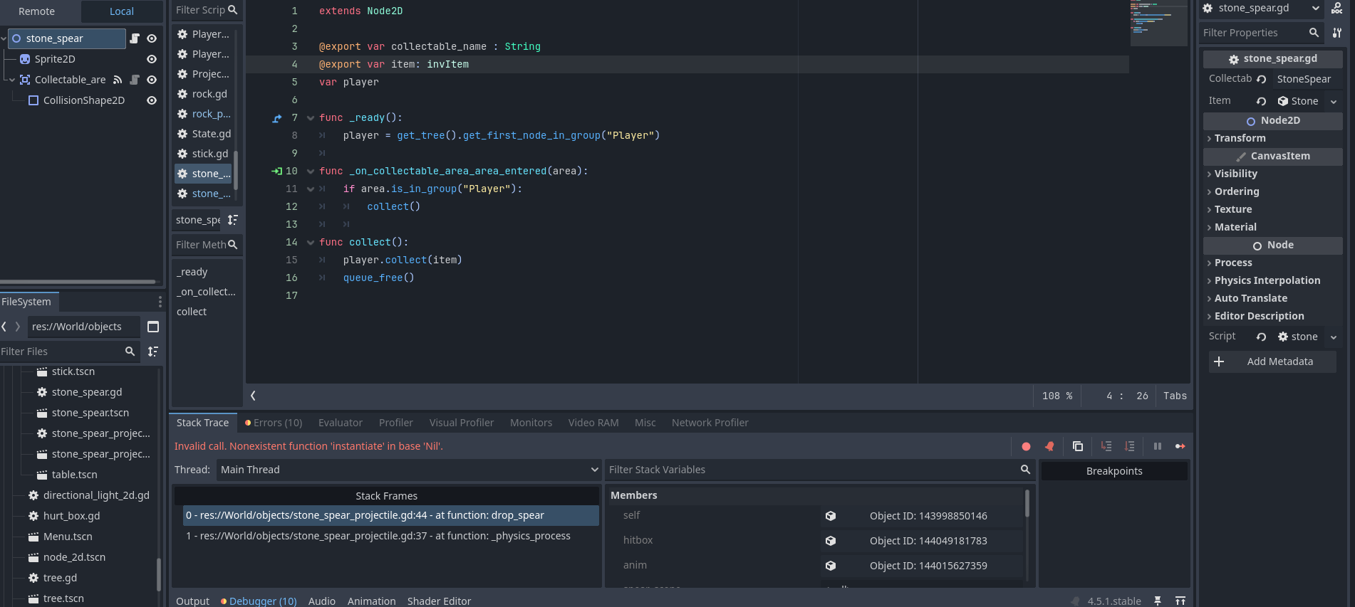 Hello! so i have created an spear item , that has a collectable area , and when the player makes contact with it , the spear_item resource that was in the spear item makes its way to the inventory , from the inventory i can use the item which uses the resources script which has the function to use it , the function makes the player throw the spear and instantiate the spear projectile(which is a whole other node) and when the distance is too far , the spear projectile despawns and the spear item spawns. It all works untill the spear despawns , godot says that the packed scene is null , i tried using my rock projectile as a debug and it works , please help im losing my mind over this ( btw dont mind the sticking into things function right now , im working on it)