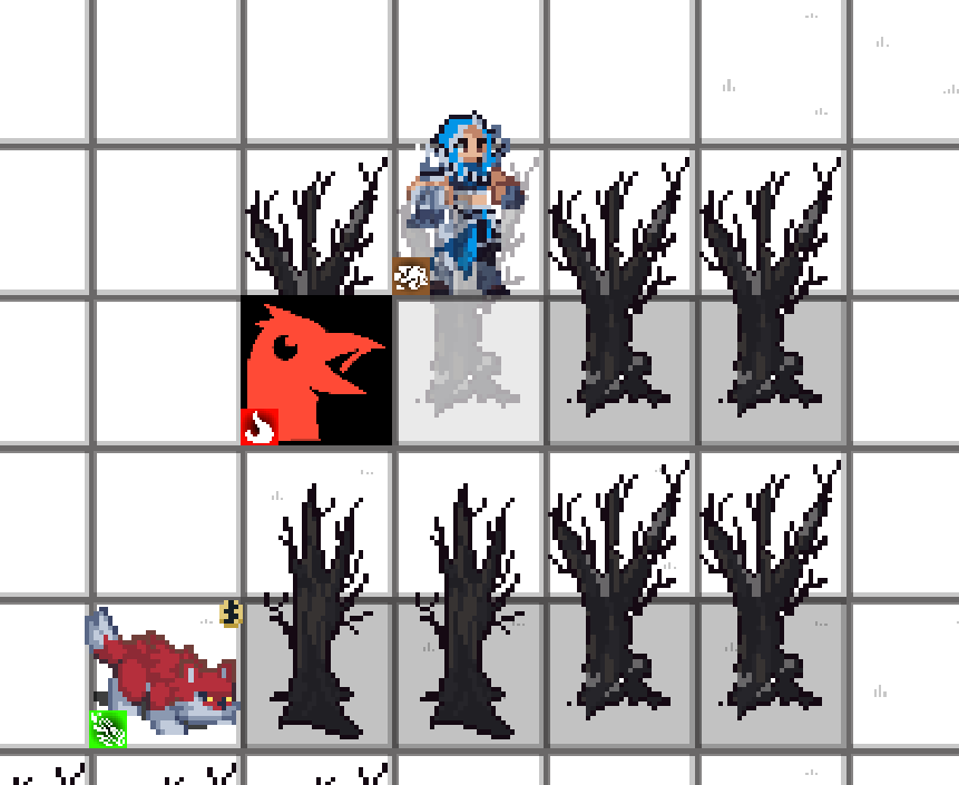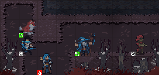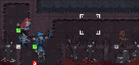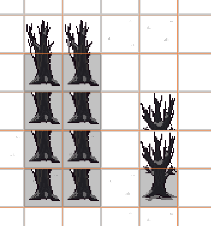 The problem arises when a unit stands behind them. They get obscured and it’s hard to see which unit it is without panning the cursor over them. If you’ve made a 2D game this is a very common problem, but since the tiles are in a TilemapLayer, and since they’re y-sorted, this has become a bit of an issue for me. The easiest and most practical solution is to simply have all tiles that a unit can stand behind be stumps - like the one below the red zombie on the right, but these tree’s are destructible, so a player could theoretically burrow into the forest and still have this problem. I could also simply discard the muti-tile-sized-tiles, but I like how it looks with the tall trees as opposed to 1x1 sized trees.