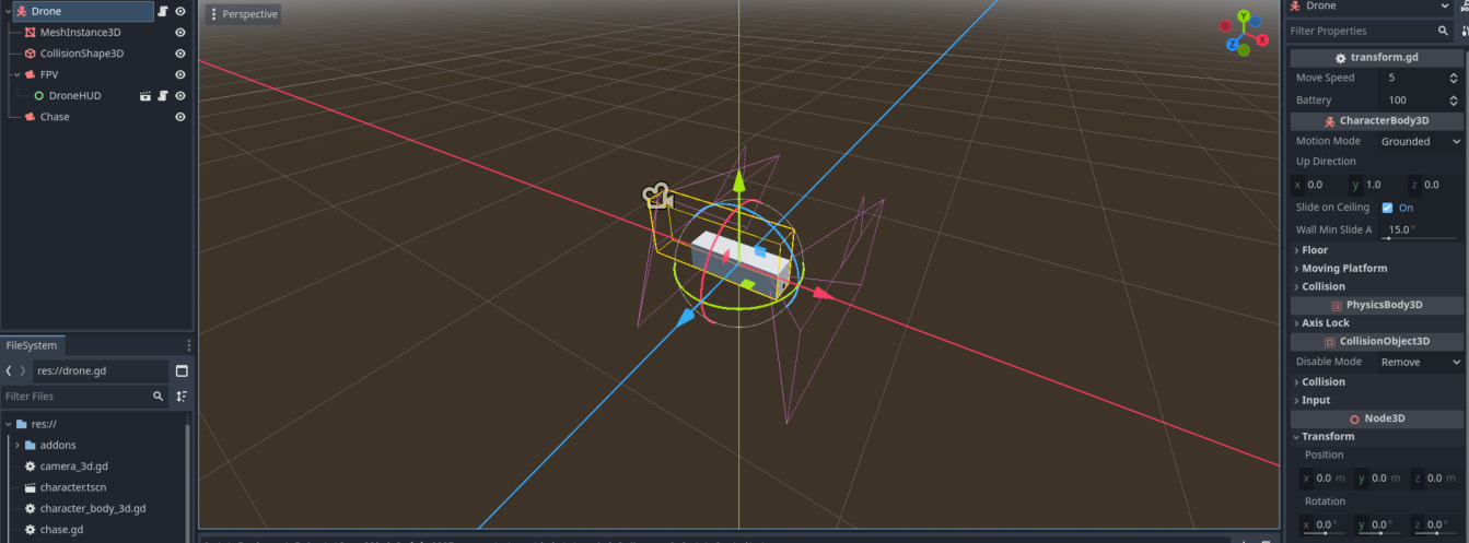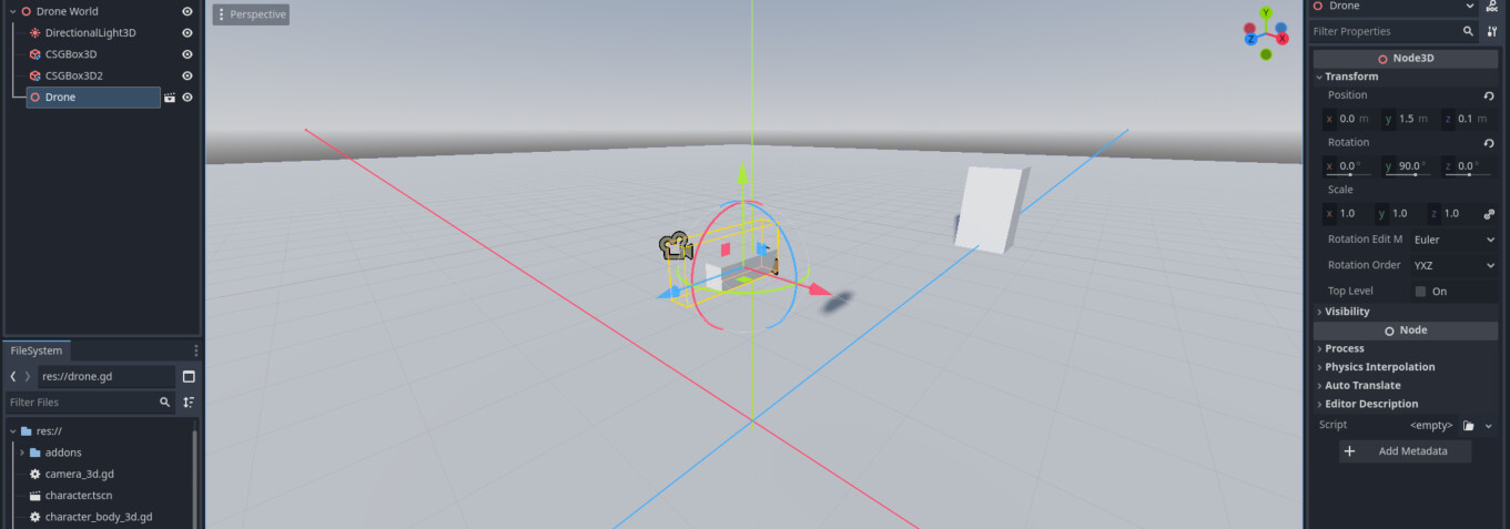 New to Godot and GDScript, and have been trying to do a demo by making a 'drone' (a Box mesh) be able to strafe. However, it's not gone very well: