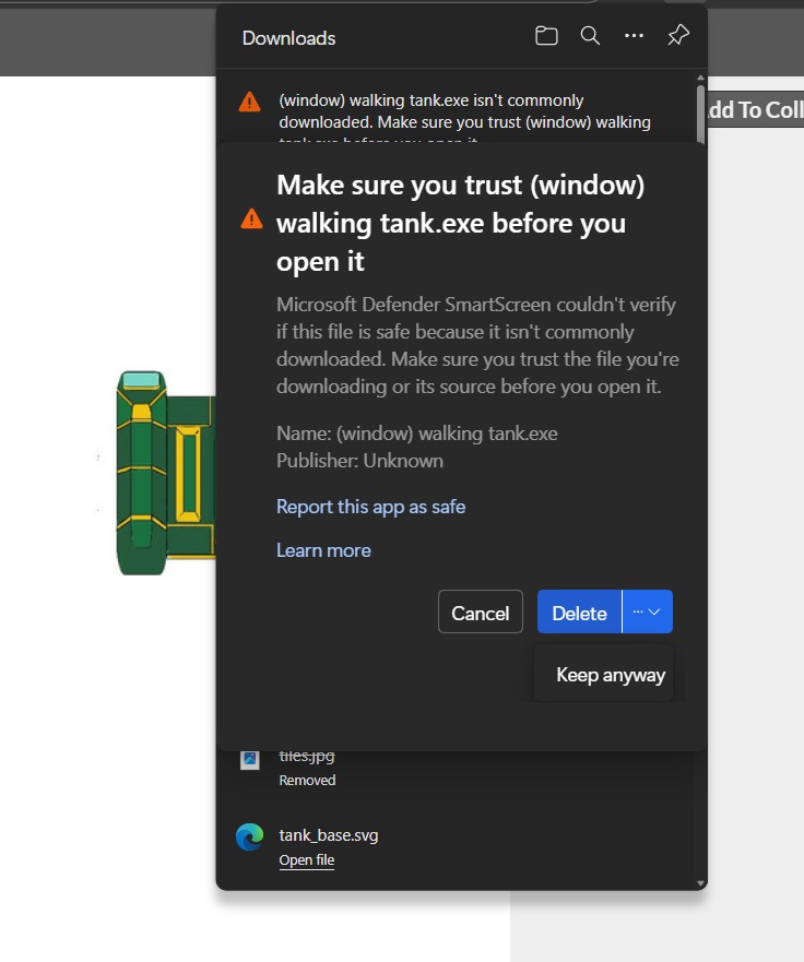 Keep anyway because that’s just windows safety system and since thats your own own file and not one off the internet it’s fine. It’s saying that because it’s not registered like @dragonforge-dev said.