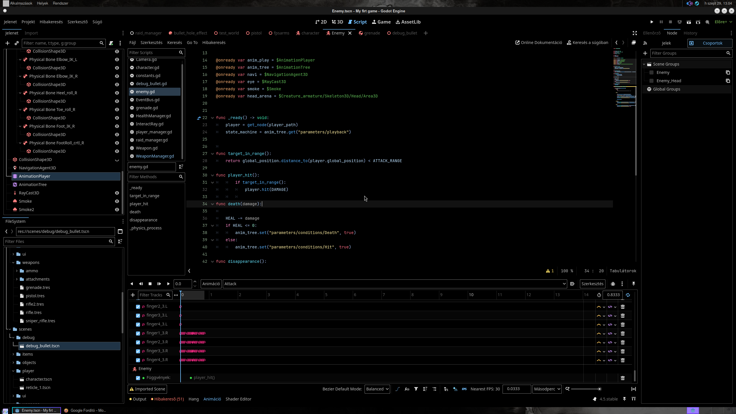 You’re calling death() based on the CollisionObject3D (which is the PhysicalBone3D in this case), but that function is on the enemy scene’s root node. So, you have to somehow transmit the call through the enemy scene.