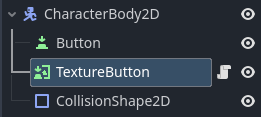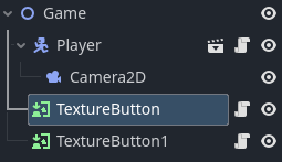 At first, I added it just so I could have something to put the Button and TextureButton nodes into. I tried using a regular 2d node, but when I added it to my game scene, I coudn’t manage to move it around. I’ve been playing around with it, and I figured out that I only really need the TextureButton node to make it how I want it. I currently have my game scene set up like this (two buttons in my game scene) →
