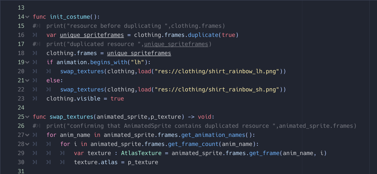 The screenshot shows the script on my AnimatedSprite for a character. The variable clothing references a child AnimatedSprite containing the character’s outfit. I want to be able to swap outfits by swapping the spritesheet texture. It works but then when there are multiple characters, all of their outfits use the swapped spritesheet texture.