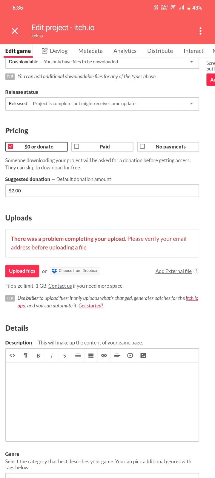 Well i m trying to upload my game on itch.io but it’s not working from mobile..