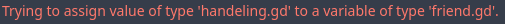 The message is clear. You are trying to assign $“.” Handeling Node to a Friend type variable. You need to assign Friend.new() The Friend class must exist as a class_name in some other .gd file or you need to preload the gd containg the.