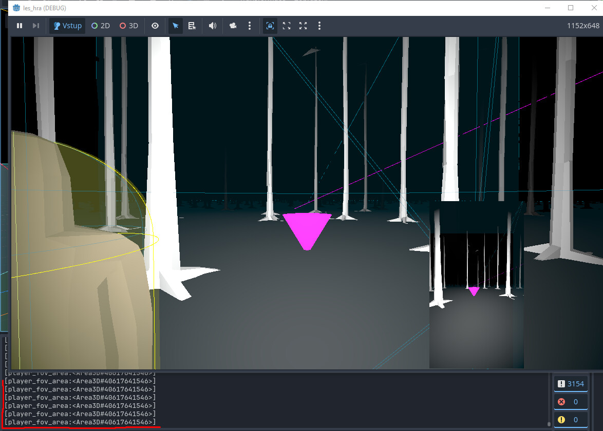 The purple area leading from the camera is the big area. And the t-posing dude has the small area on him, he also has the script with “print(detection_area.get_overlapping_areas())”.