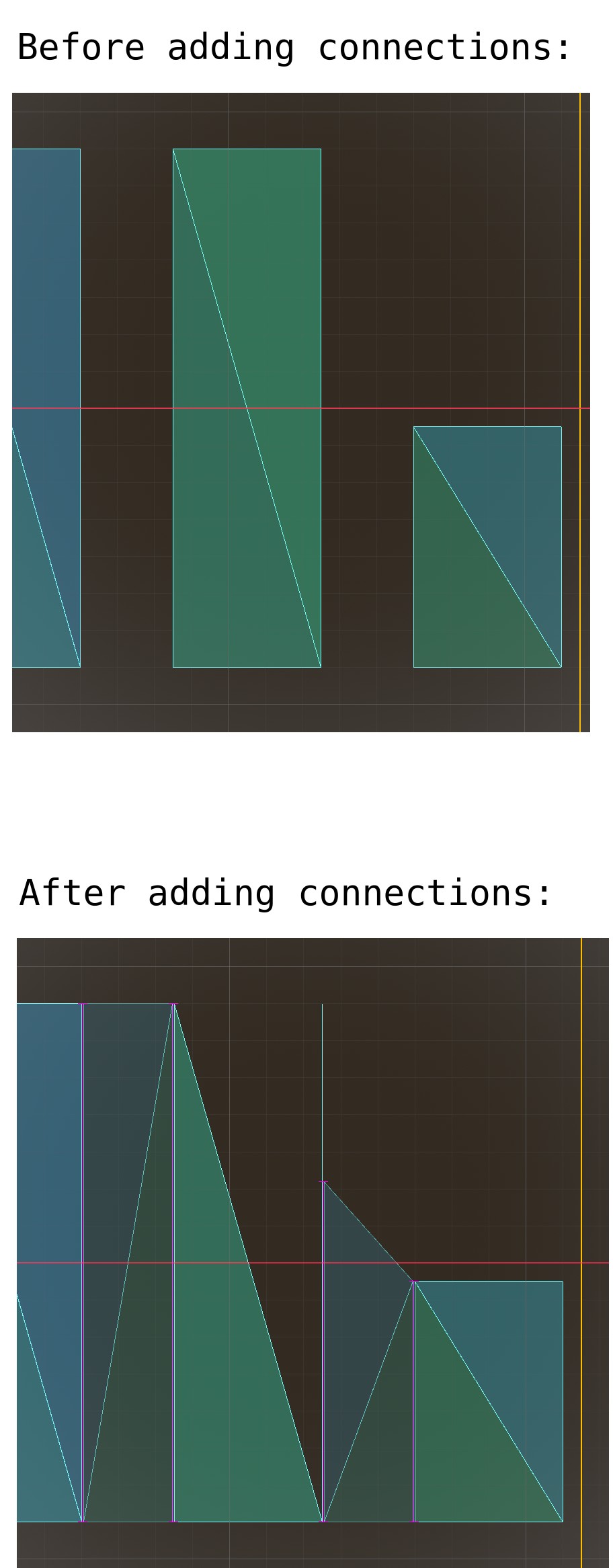 PPS - these images might help clarify the problem. Beforehand there are 3 rectangular portions of the navmesh; afterwards connecting regions have been added, necessitating an extra vertex in one triangle, and this has caused the triangle to disappear in the editor.