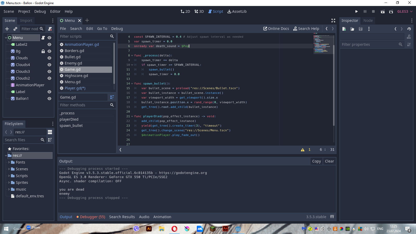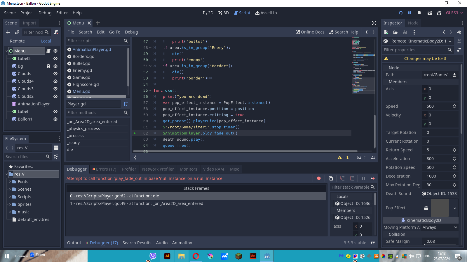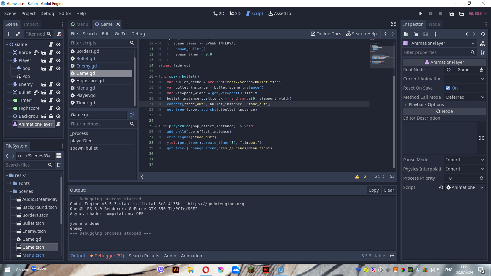 Put line 62 in your Game.gd script in the playerDied-method. “$” only accesses child-nodes. The animationPlayer is a child of the Game-Scene and not of the Player-Scene