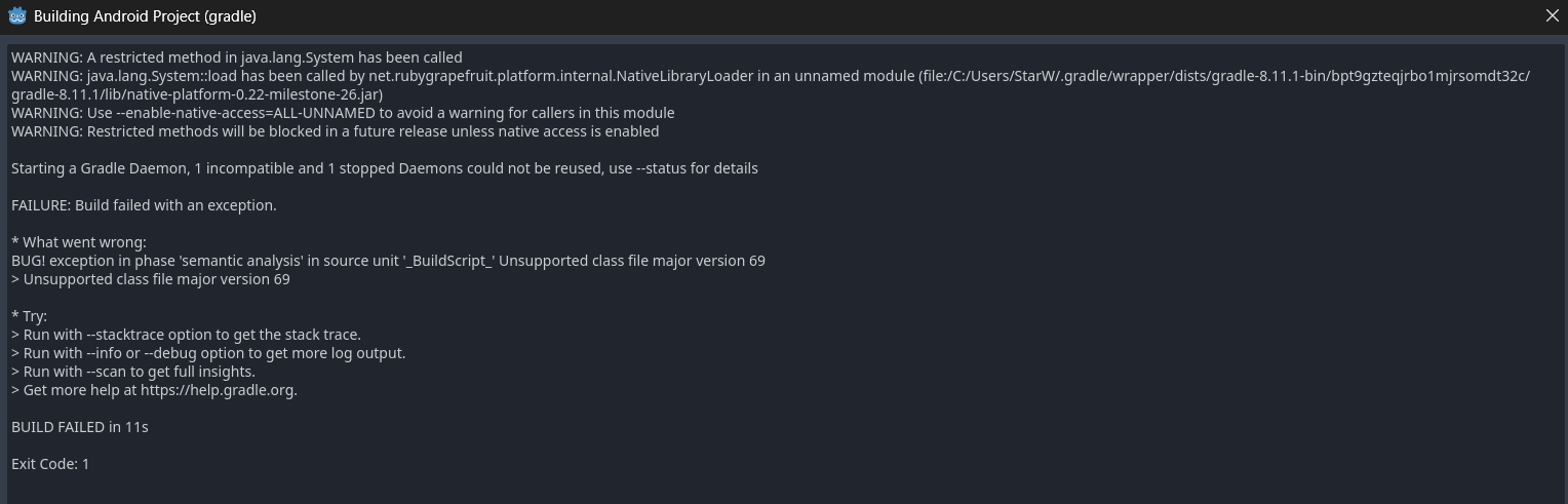 WARNING: java.lang.System::load has been called by net.rubygrapefruit.platform.internal.NativeLibraryLoader in an unnamed module (file:/C:/Users/StarW/.gradle/wrapper/dists/gradle-8.11.1-bin/bpt9gzteqjrbo1mjrsomdt32c/gradle-8.11.1/lib/native-platform-0.22-milestone-26.jar)