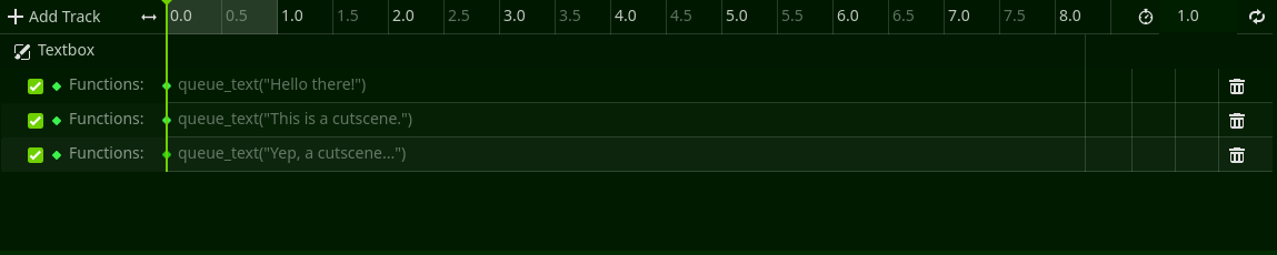 This is the first AnimationPlayer node, which has the first lines of the intro. I’m using the Call Method option from this textbox to get the queue_text() function, which makes the text appear and work in the first place: