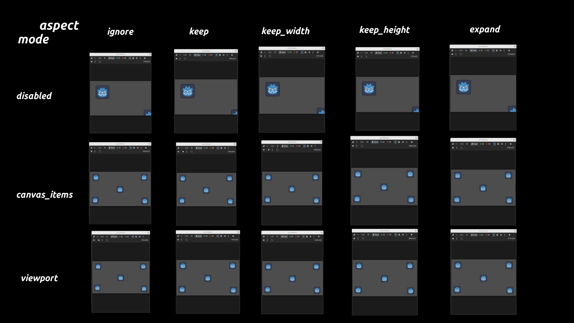 - read the “multiple resolutions” godot docs page (i cant reproduce some of the effects shown in the gifs)