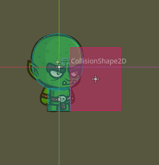 Furthermore, the yellow background is the CollisionShape2D for the VisionArea2D, which determines the range a Goblin can throw a dagger. Both of those nodes are new to the inherited Goblin scene, but do not break inheritance of the original scene, even though they are positioned in the middles of the inherited nodes. It looks like this in the 2D view: