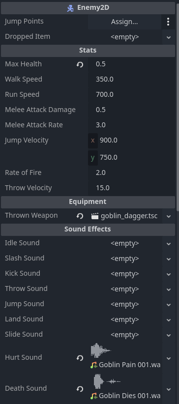 On the Goblin node itself, I have changed some @export values for the Enemy2D