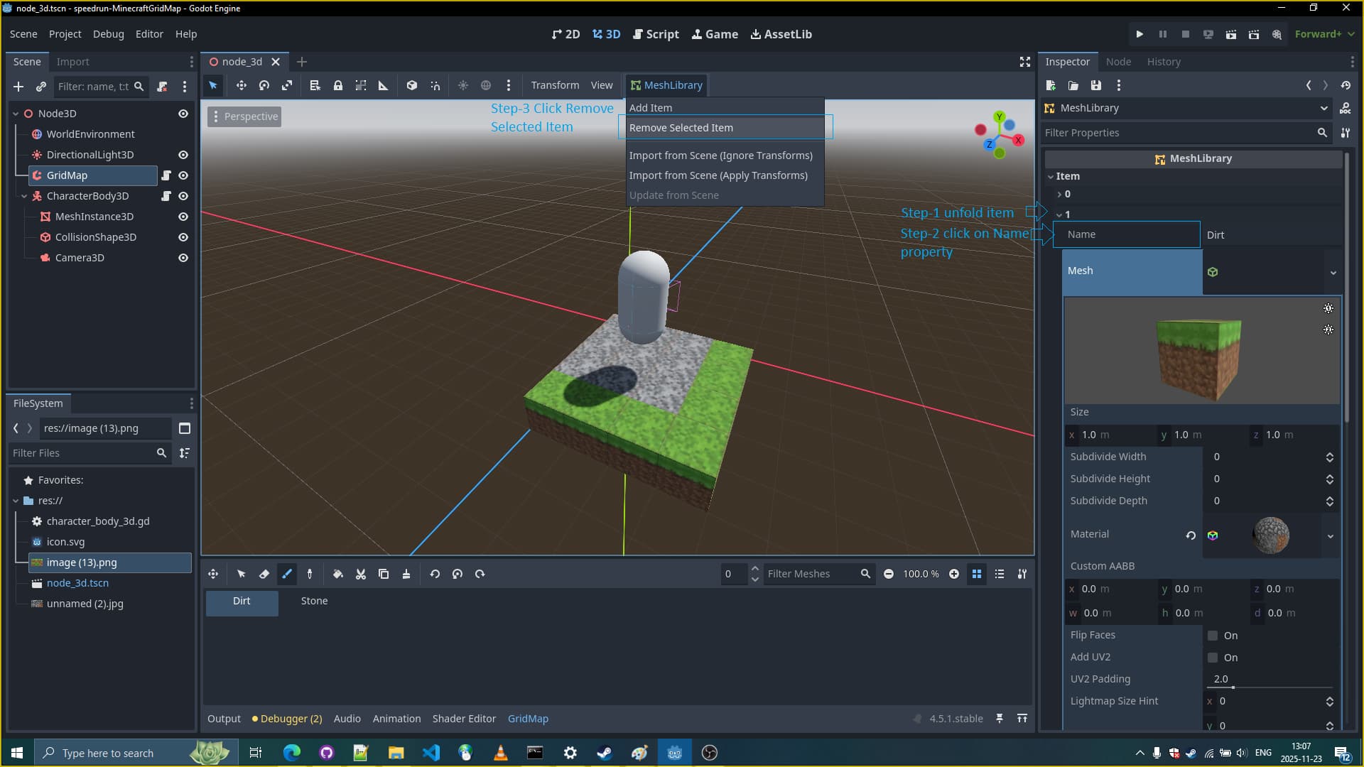 How to select and delete item in MeshLibrary