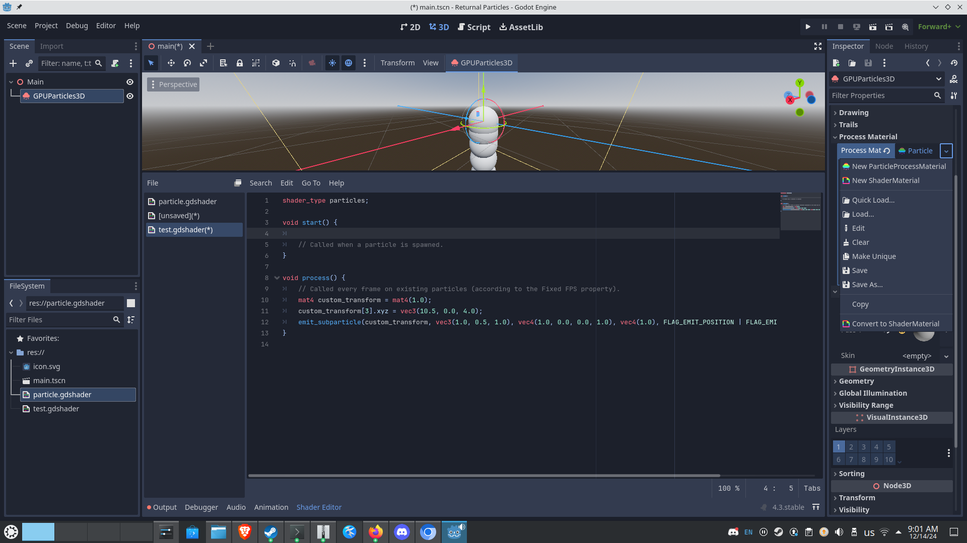 This provides you with a shader which does everything you’ve set up your ParticleProcessMaterial to do, but allows you to manually edit it in case you need something weirder/cooler. Given the lack of demonstrable particle process shader code on the web, this is at least a way to see how a shader might use different internal flags to achieve an affect, and build skill.