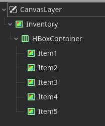 The HBoxContainer is anchor in full rect and is responsible for the items being displayed in a row with a correct spacing. The five Item nodes are placeholders for the screenshot purpose only.