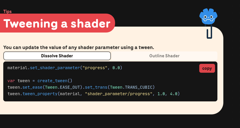 (This was the new page, but after being pointed out that you can tween a shader parameter using a PropertyTweener, i’ve updated the guide to use the screenshot seen above)