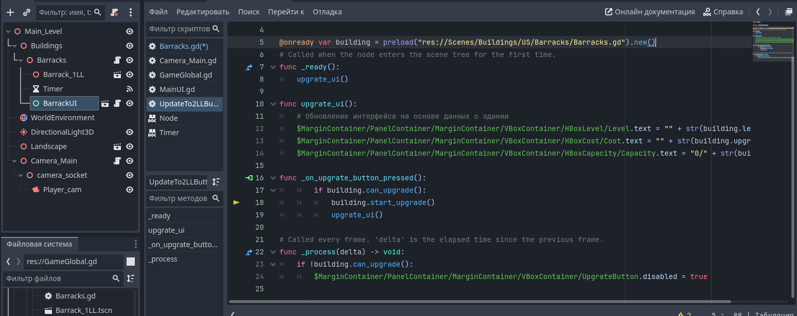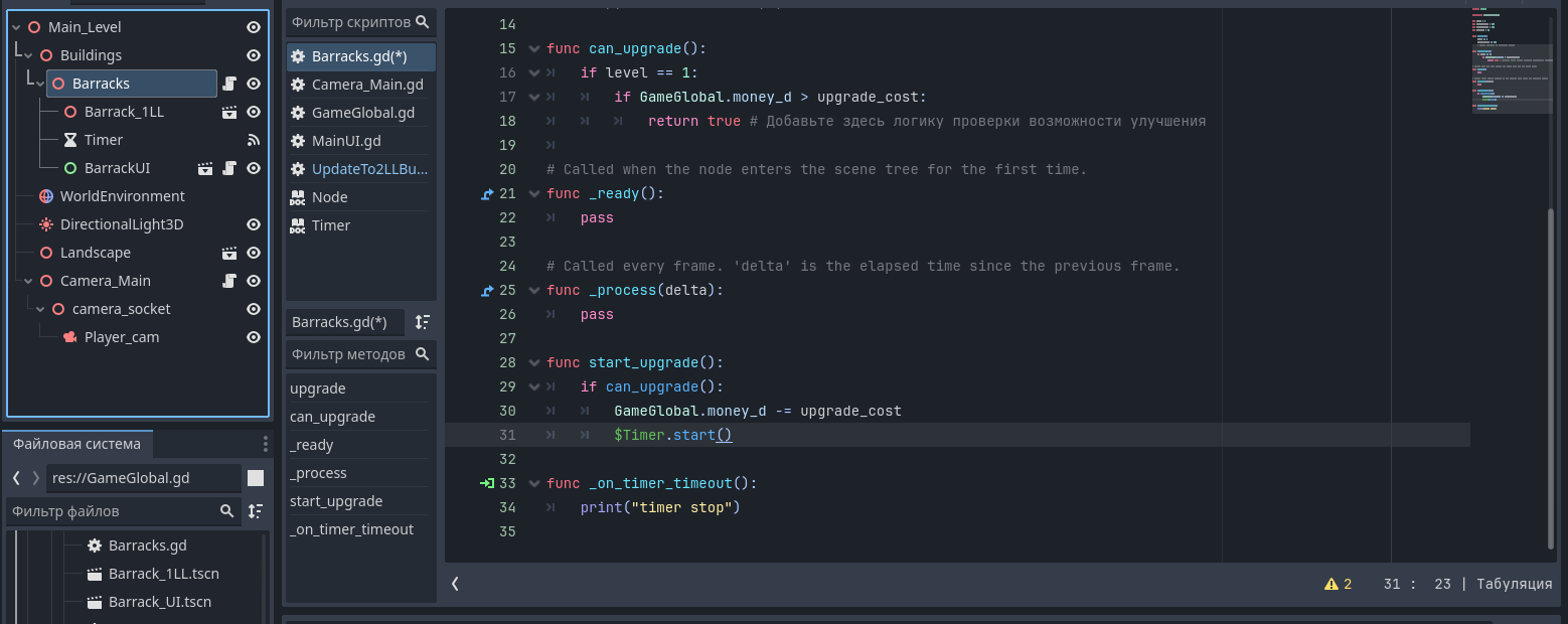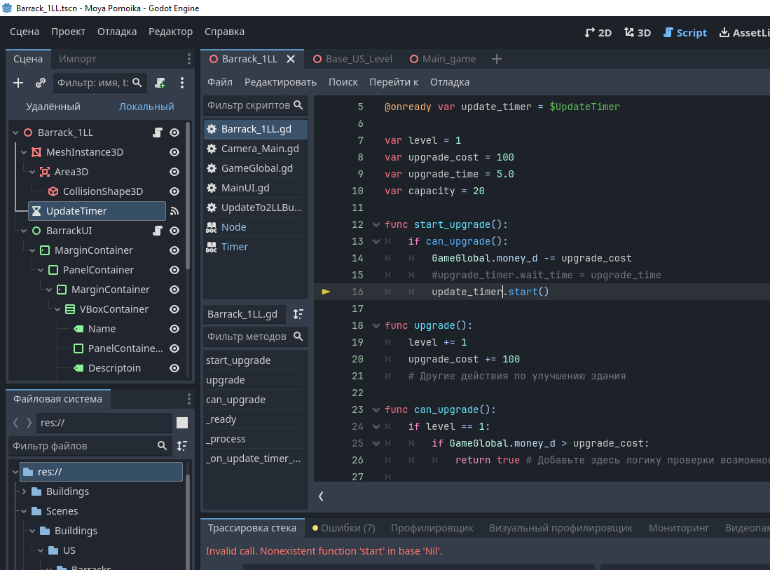 I’ve changed the code and hierarchy a bit to something I think is more convenient. After checking a few variants, I realized that the timer.start() function gives an error when it is in the start_upgrade function, which is called in the function handling the button press signal in another scene.