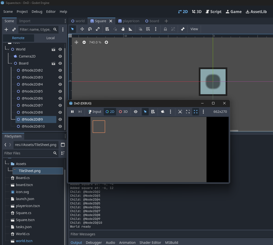 GD.Print("Starting position: " + boardPosition);for (int x = 0; x < gameBoardHeight; x++) { for (int y = 0; y < gameBoardWidth; y++) { xOffset = x * squareSize; yOffset = y * squareSize; var square = new Square(new Vector2(boardPosition.X + xOffset, boardPosition.Y + yOffset)); AddChild(square); GD.Print("Added square at: " + square.Position.X + ", " + square.Position.Y); } } ViewChildren();
