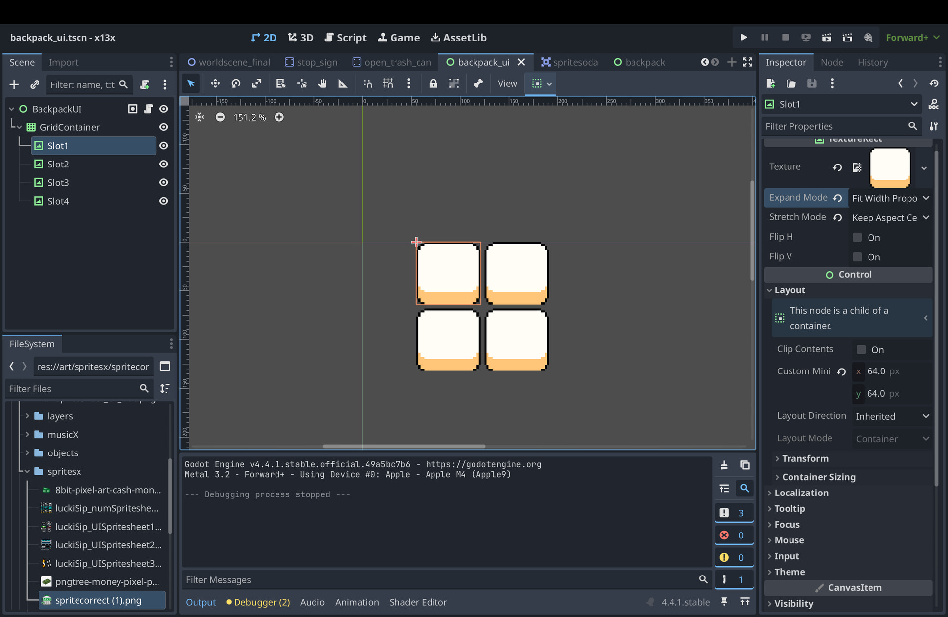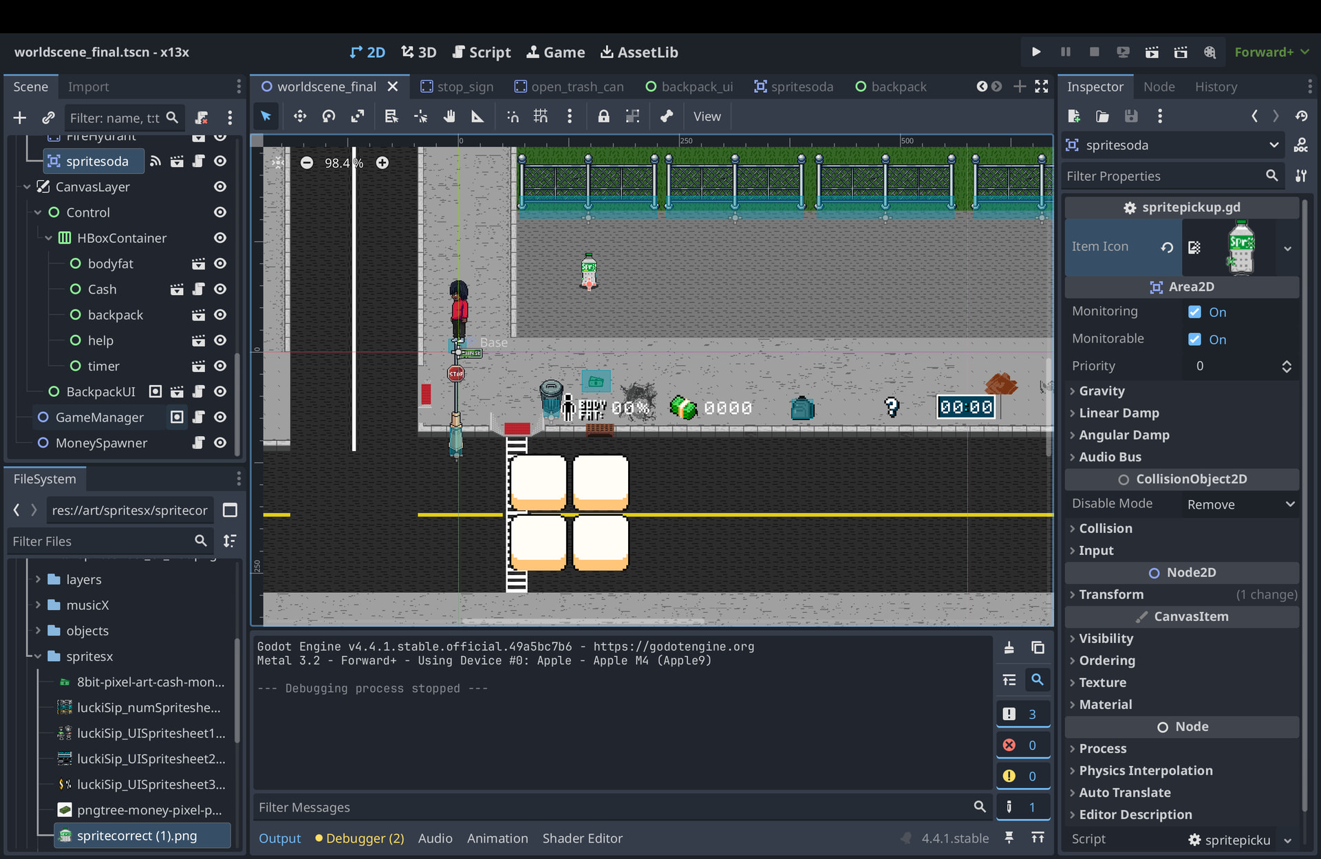 I’m implementing a simple inventory with 4 slots. The inventory UI opens when clicking a backpack icon, and I have an item in the world (a Sprite soda) that the player walks into to pick up.