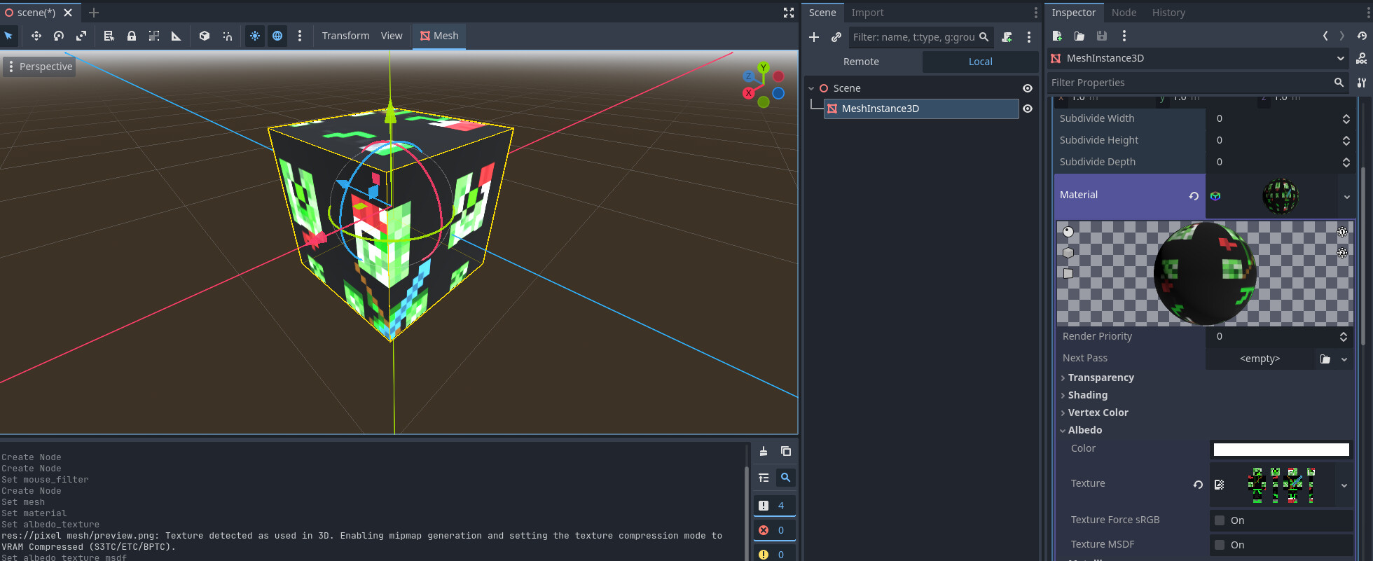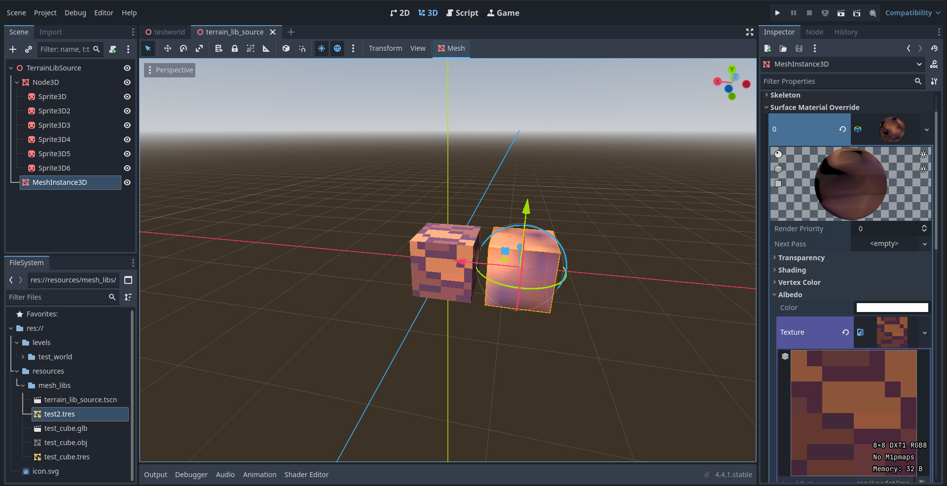 All I’m asking is a sharp, pixelated texture on a MeshInstance3D, where I can also add a sharp, pixelated normal map. It would also be nice to be able to use an animated texture, but that’s secondary. I just need to somehow get the pixelart into my Mesh Library and I’m getting desperate.