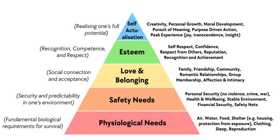Sorry, but I donāt like Maslows work here at all. Peoples needs are not static, are often culturally based and this greatly oversimplifies what is in fact an incredibly complex topic, turning an extraordinary network of interdependencies into a simple ladder based on mid century western culture.