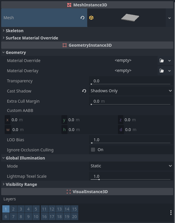 I have unwrapped the UV2 for lightmap/AO from within Godot for the meshes of the level, ceiling, char capsule, and doors. The Char capsule GI mode is set to “Disabled”, all the rest to “Static”.