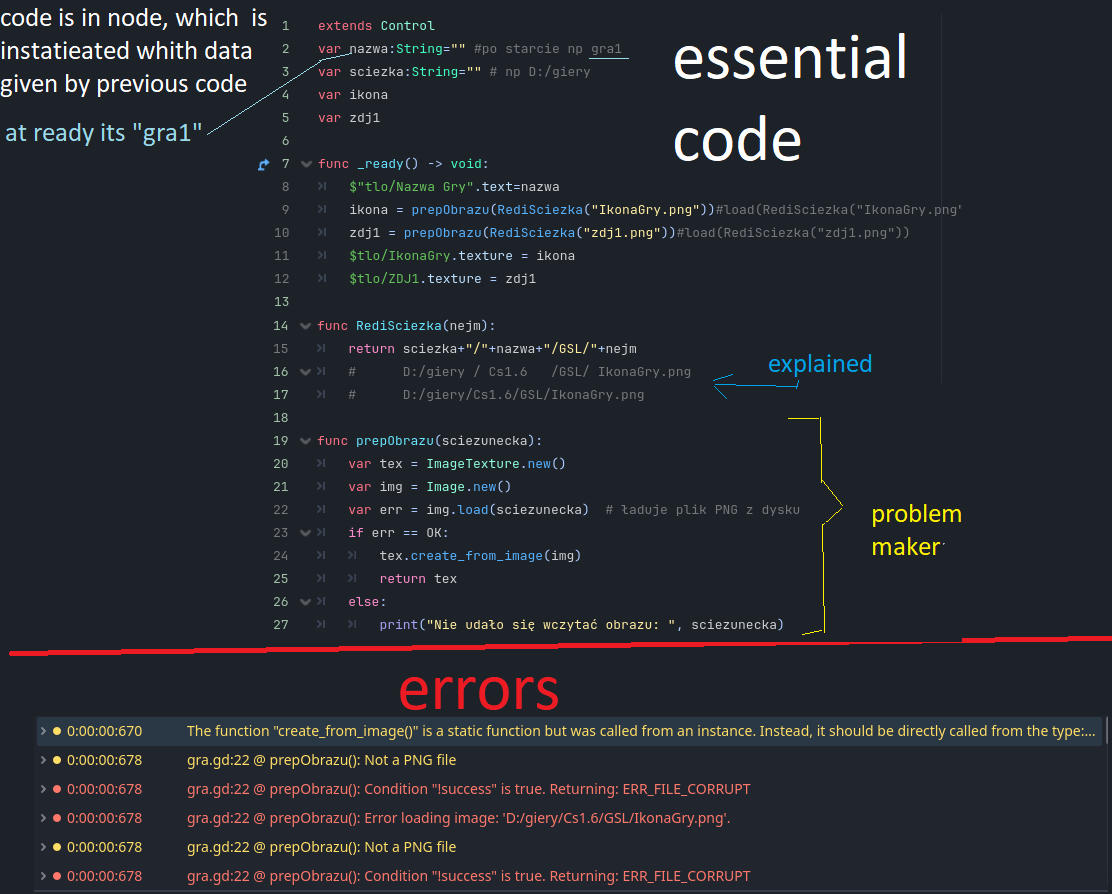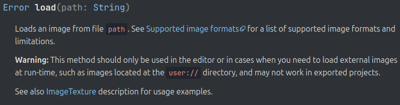 Well, there’s a difference between ImageTexture and ImageTexture.new(). You assigned ImageTexture.new() to the variable tex, which means that it has a value of the typeImageTexture. Just ImageTexture alone isn’t a value (so you can’t assign it to a variable) but a class or type. Static functions, like ImageTexture.create_from_image(), are supposed to be called on the type, which is why tex.create_from_image(img) caused a warning. Non-static functions, like Image.load(), need to be called on the value, so Image.load(sciezunecka) would cause an error while img.load(sciezunecka) works.