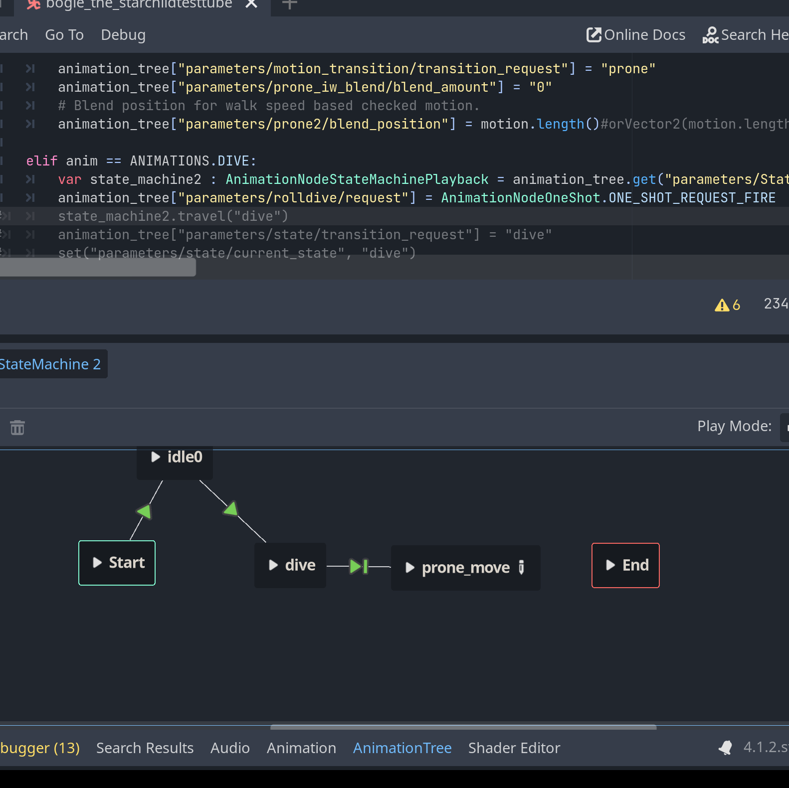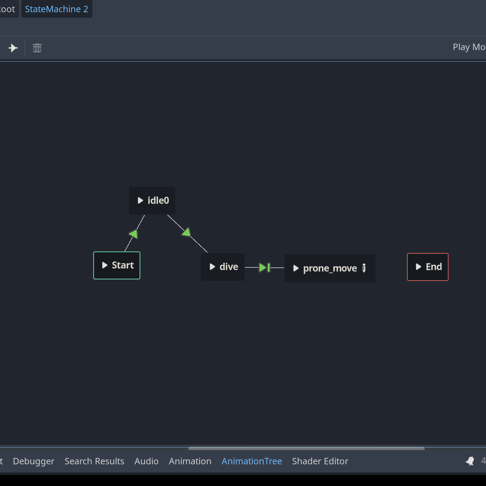 Logically, how would I build this character ability in GODOT:(see example) a dive that ends in a prone state?(EXAMPLE OF A LOGIC: DO I USE A ONESHOT NODE THAT HOUSES A STATEMACHINE[something I’ve tried to little success])- I’m open to multiple ways to do it, I just can’t seem to figure it out at the moment and would like some help with a logical approach and possibly coding.example of the dive