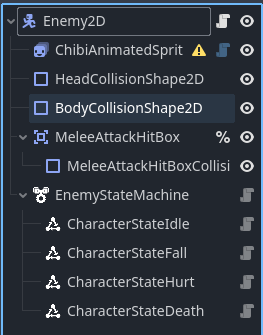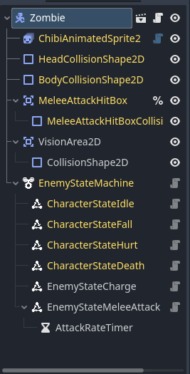 It is exactly like that. Except that instead of creating Enemy in the Godot editor using its scene tree, you have to create it all in code in the enemy_2d.gd file. And also you cannot see or edit any of those nodes in the Zombie scene unless the game is playing. The best you can do is turn it into a @tool script and add a bunch of code to allow you to edit those invisible child nodes.