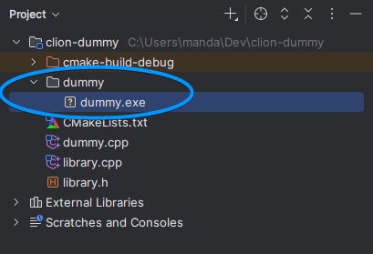 When you build your library, CLion will execute dummy.exe, which does nothing, and CLion stops complaining.
