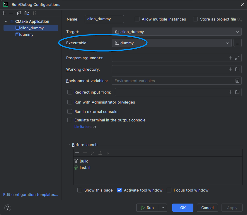 To make CMake put the executable in a place where you can find it, you need to enable the install task of the build process. Edit the configuration, and you will see this window: