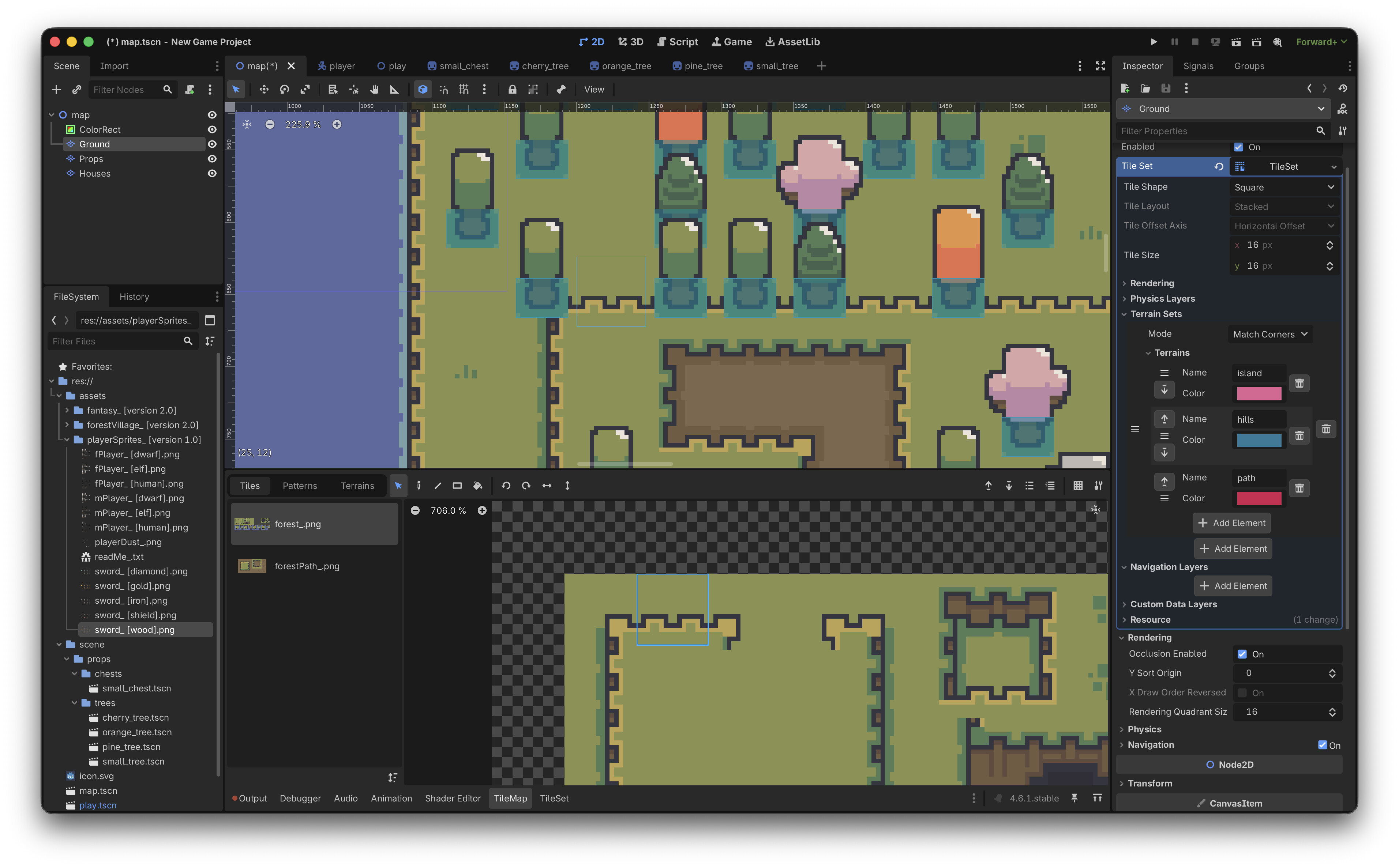 Right now, if I place the cliff as a normal tile, the entire tile is treated the same way in sorting, so the player is either fully in front of it or fully behind it. That does not work for the shape I want, because the cliff edge should act like an occluding surface only near the bottom, not across the whole tile.