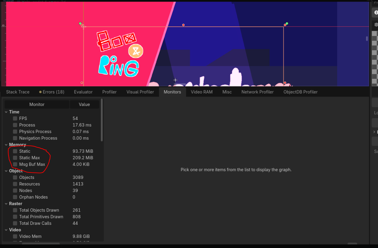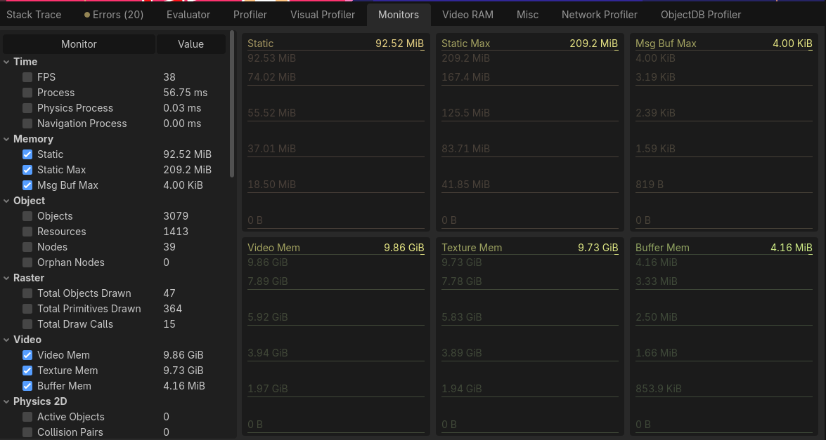 So let’s see your memory usage charts from Godot’s monitors.