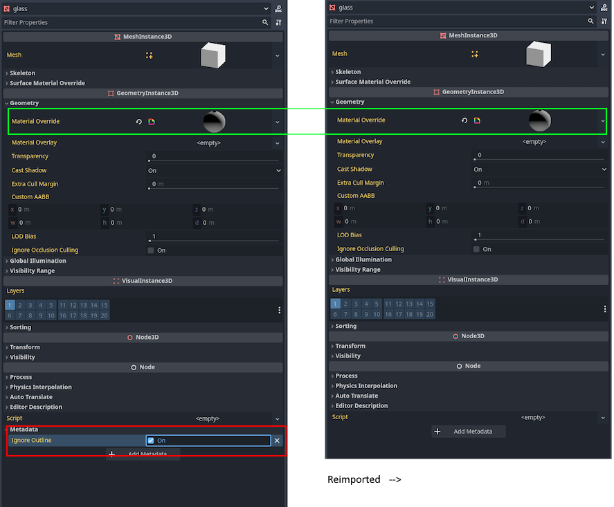 But I think your suggestion on script looks great. My case is that when loading scenes, I need to add a special shader material which adds an outline to all MeshInstance3D except something like glass. I had thought adding a script is an overkill as all I need is just a flag. But now I realize it’s not a bad idea, and it works in re-import! Thanks!