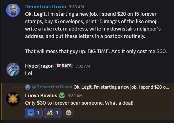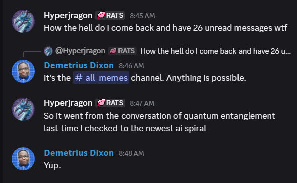 It’s pretty chill over here. I’ve recently added channels for programming and we have a lot of fun with memes and discussion about anything really.