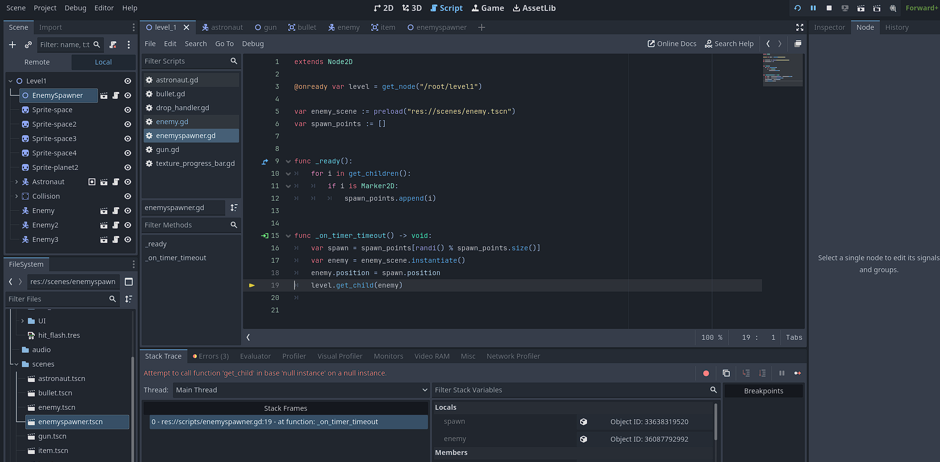 But! (again!) if you want to add the enemy next to the enemy spawner you can use add_sibling(enemy) instead of level.add_child(enemy), so you can remove the var level line in general.