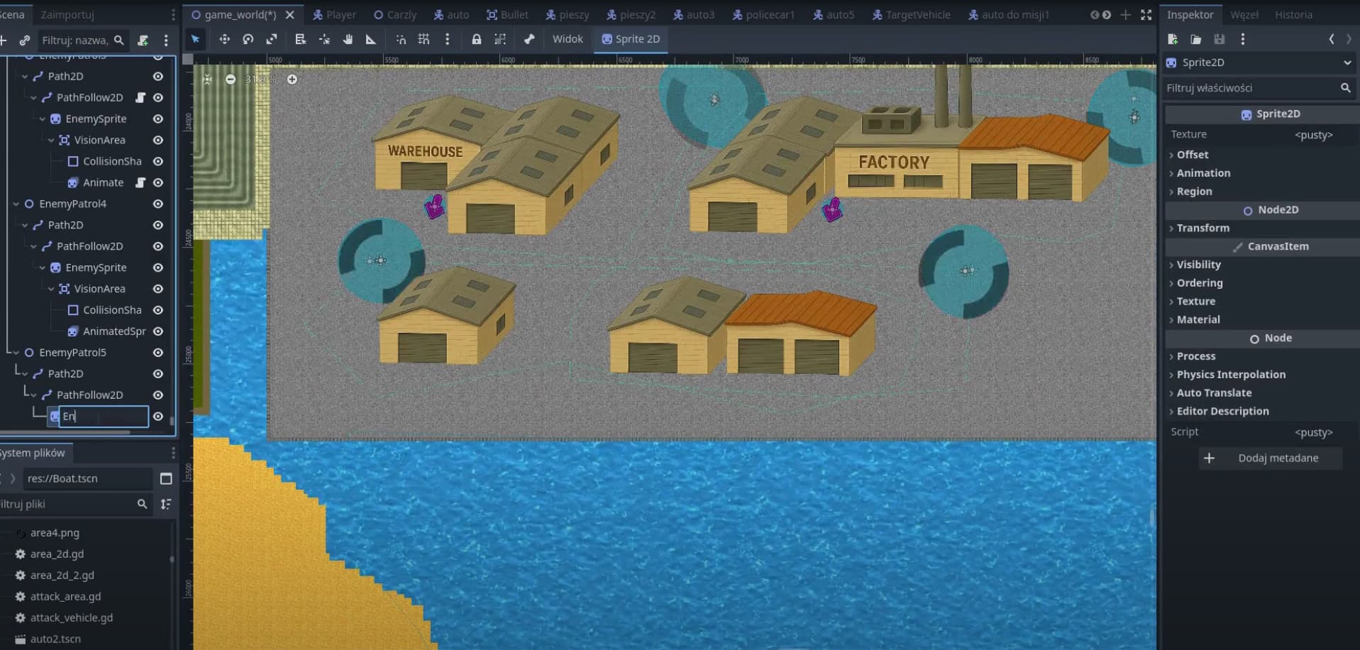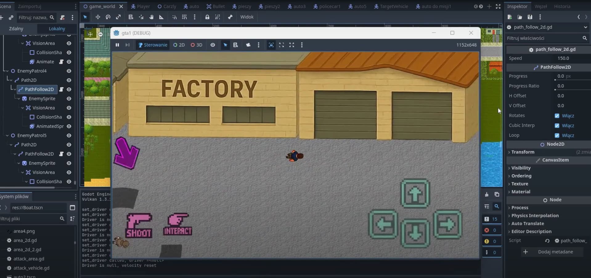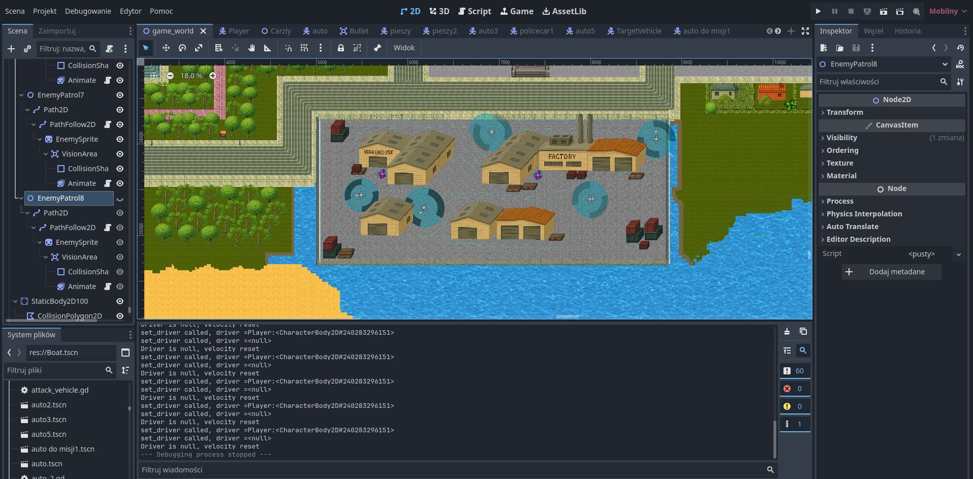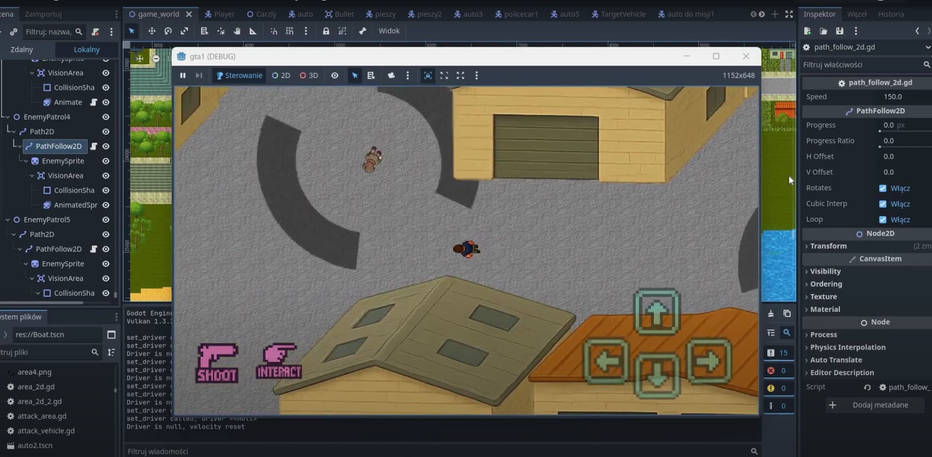 I’m developing a 2D open-world action game focused on missions, exploration, and vehicles. The player can walk around a large city map, enter various cars, complete scripted objectives, destroy targets through collisions, and collect items under time pressure.