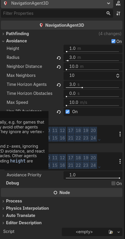 yeah no problem. The navigation agents don’t avoid each other with a radius of 3m like specified in the avoidance settings for the navigation agent. I don’t understand how to configure the navigation agents or the navigation region. They are all finding paths perfectly, and they use simplified paths. I am hoping to get some information or a link to relevant information offering intuition on the topic of setting up avoidance so that they avoid each other.