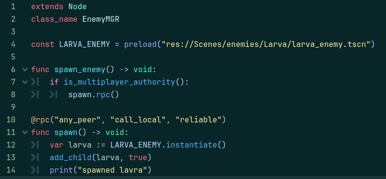 as it is above, the same situation happened like with previous code with authority check but it errored on add_child(larva, true) it had problem with “true” and adding individual name to an enemy but worked fine in game. If I added_child without “true” then it worked but enemies weren’t synchronized. Without checking for authority more errors happened but not much success.