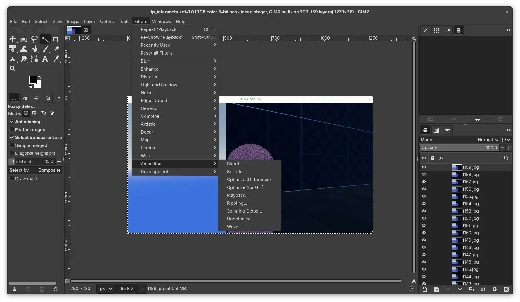 Moving on, inside GIMP from the menu bar, File > Open as Layers.... Before exporting, the playback can be previewed from Filters > Animation > Playback.... Some optimization in term of file size can be done through Filters > Animation > Optimize (for GIF), but it can affect the quality of each frame. Since it copy each layer before applying the filter into another working file, it can be tested without losing original layers. Finally, it can be exported to a gif file from File > Export As....