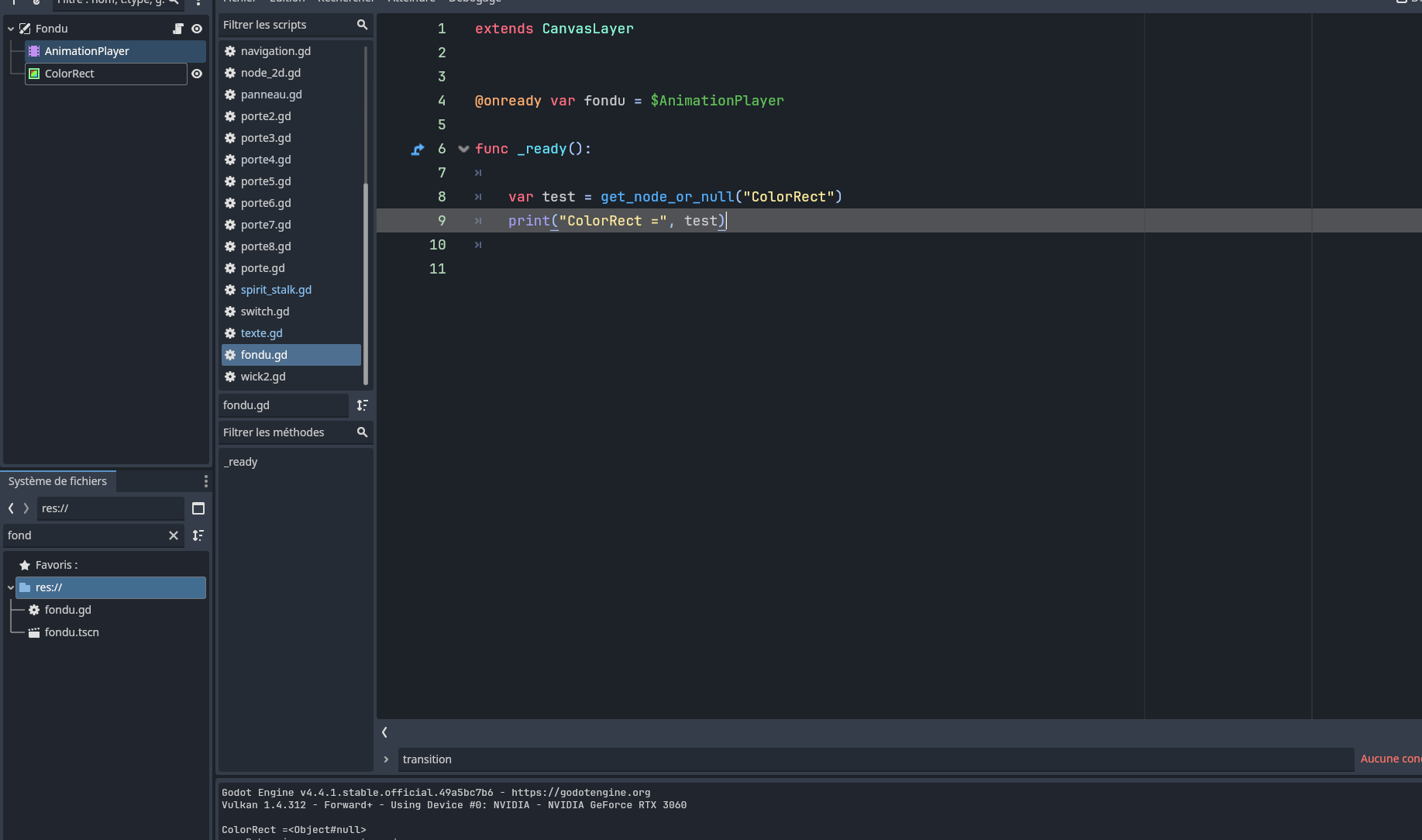 Hi ! I have a problem with a transition animation i want to make. The ColorRect return to a null instance each time i try to call it. Here is a exemple of a simple print i tried to show you the problem. The ColorRect is here, child of the script as it should be. But is still not found by Godot. Why ? ( sorry if i did a stupid mistake, i'm really new to that stuff )
