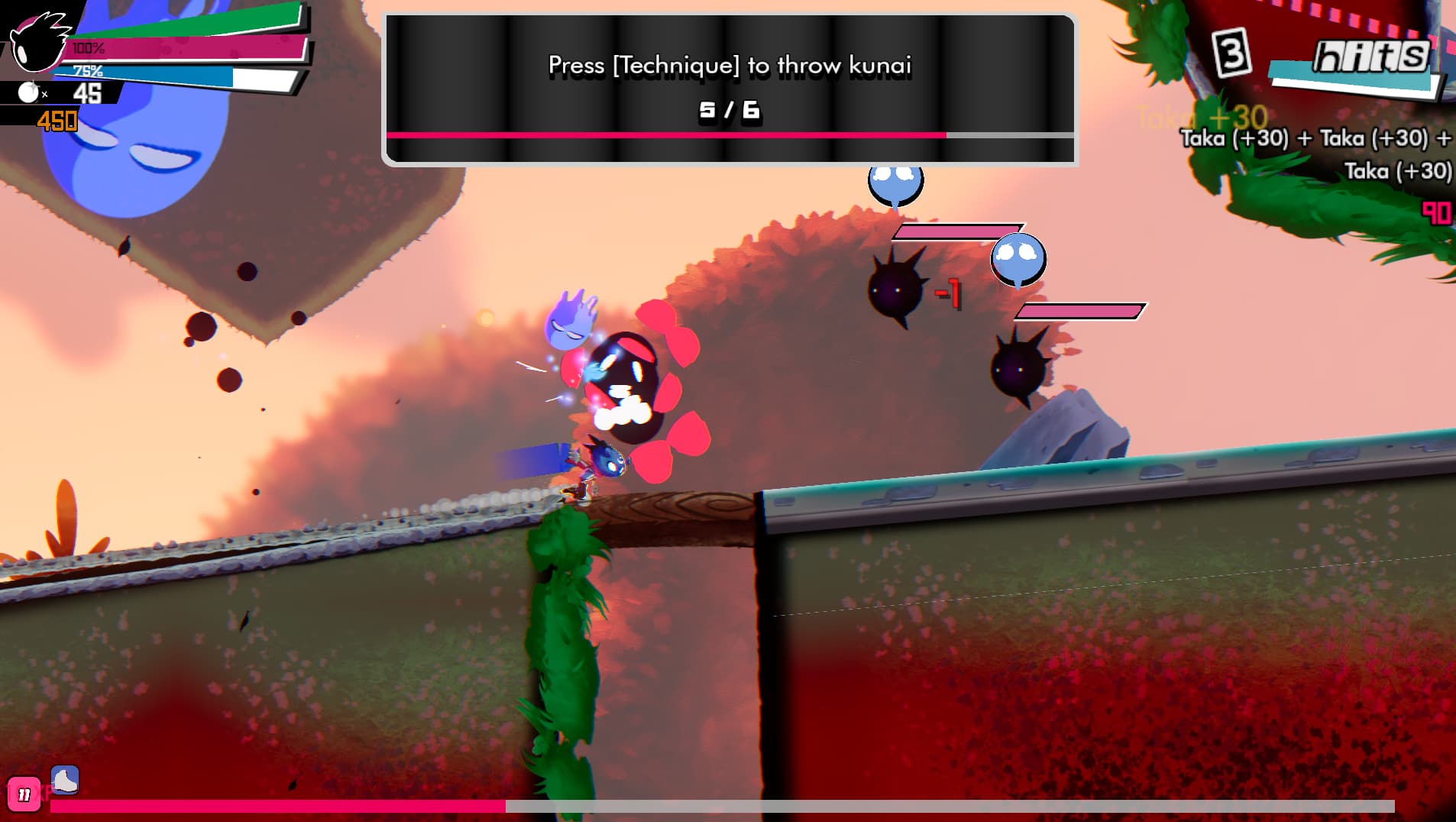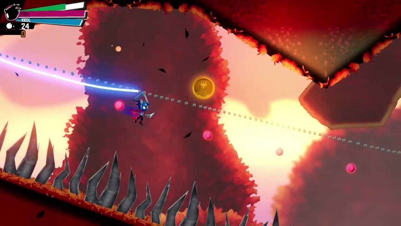 -Player progression system - Your combos, scores, medals collected and levels completed net you XP. Gain enough XP to earn “tags”. Tags are perks that you can equip (one max) to alter your gameplay. (Think spare health orb in a pinch, float while falling, prevent sliding while wall-sliding, temporary speed-boost)