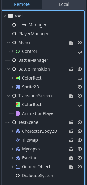 TestScene is Node2D, and BattleTransition is a CanvasLayer, I don’t know why they look like Nodes in the Remote Scene Tree. But I could try making a heart to follow the player its own scene.