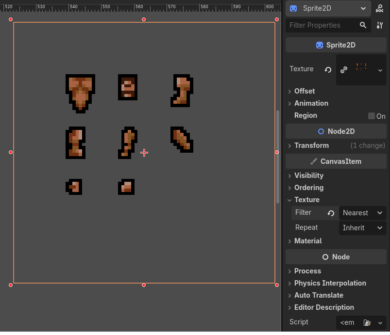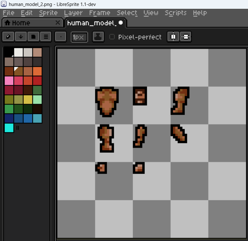 You can see, among others, that the revised neckline on the torso (top left) in Libresprite doesn’t show in the Godot editor. Doesn’t show at runtime either.