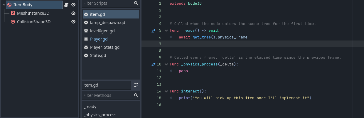 I’m trying to make an item that will fall out of chest and player can interact with it. So I need for an item to have gravity. The raycast is in the player’s head in the middle of the camera. When I use StaticBody3D type of node everything works, with CharacterBody3D it works as long as I don’t add physics, with RigidBody3D it doesn’t work at all. The interaction prompt blinks for 1 frame and then it disables. Would be really grateful for help, didn’t find anyone encountering the same problem.