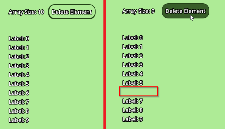 I’ve got this very simple setup with 10 labels in an array, and a button which manually deletes the 5th element, however, it’s deleting the 7th element for some reason, this happens every time repeatedly.