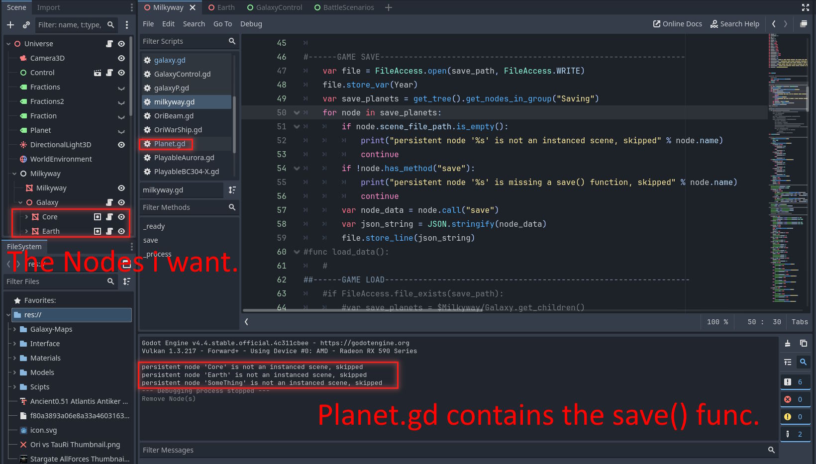 What data are you trying to save? This saving code relies on the scene path likely to re-instantiate scenes that were dynamically instantiated, like if your “Earth” node shouldn’t be in the scene until a certain point or purchase.