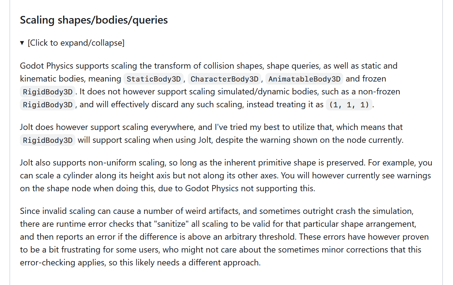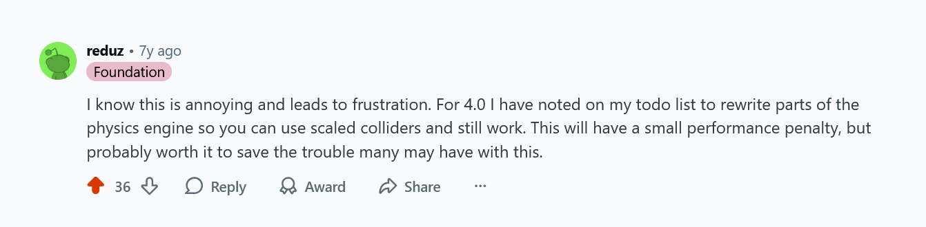 but I can’t find any follow-up on whether that’s still planned or has been implemented now that we’re deep into 4.x. I’d love for scaled colliders to have been quietly added, if anyone has confirmation one way or the other.