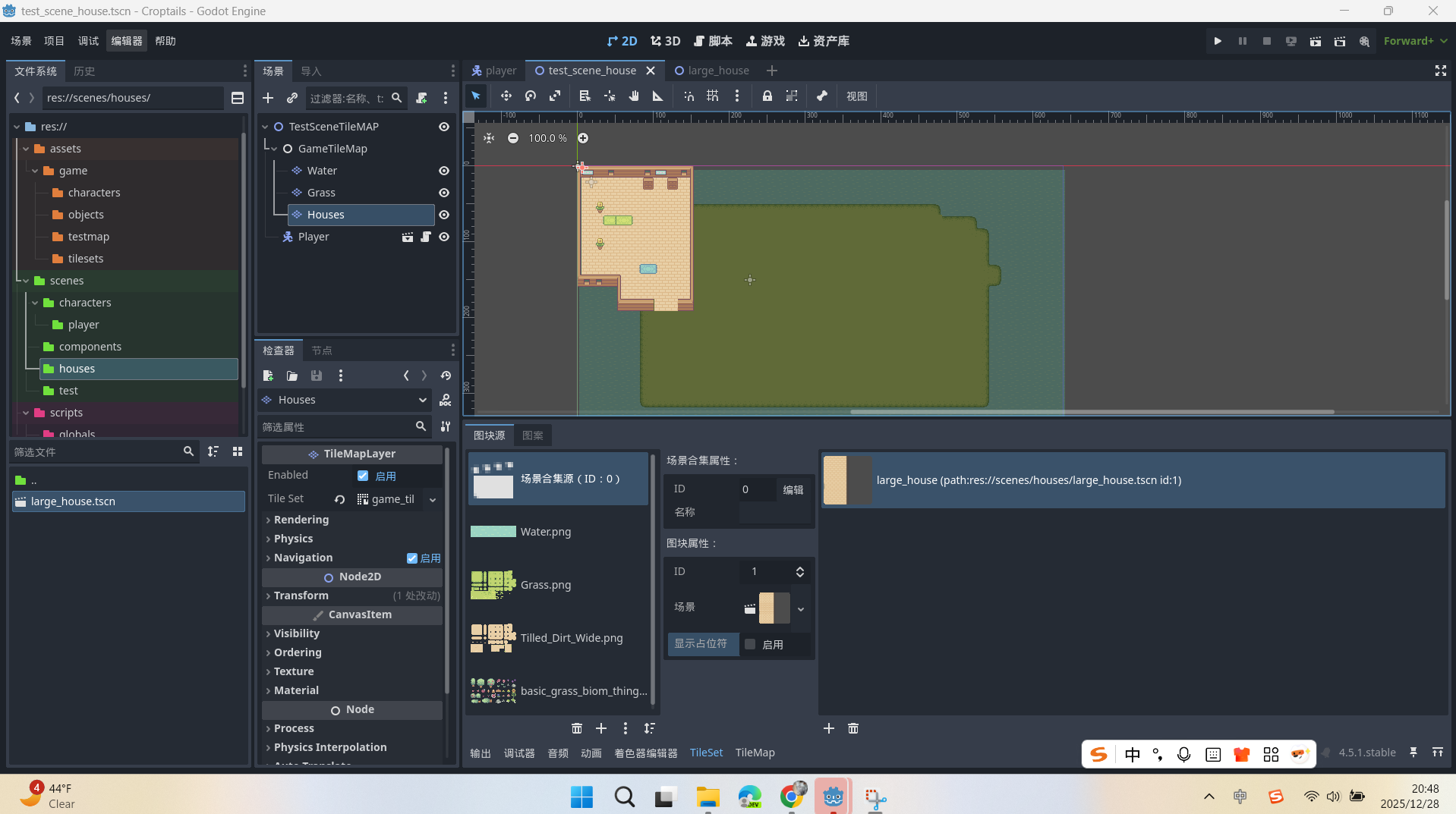 In test_scene_house, I added a new TileMapLayer called house, set its TileSet to game_tileset, and added a Scene Collection Source to the TileSet. Then I added large_house.tscn as a scene tile inside that Scene Collection Source.